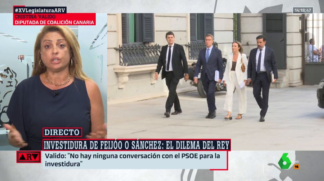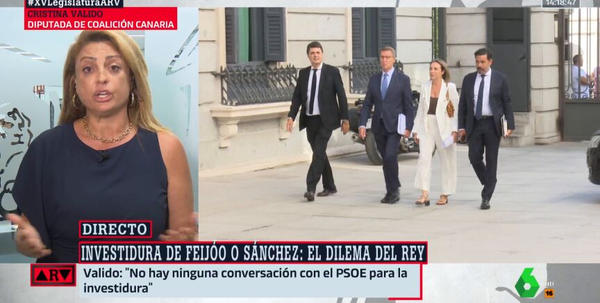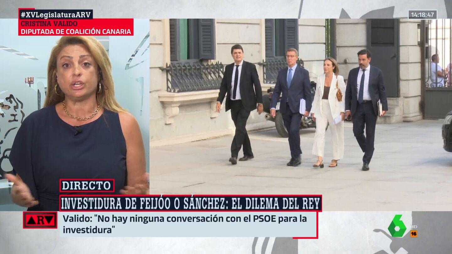 La diputada de Coalición Canaria, Cristina Valido, ha abierto la puerta a Sánchez siempre que muestren un compromiso con sus intereses. De momento, han trasladado al rey su apoyo a Feijóo durante la ronda de consulta, y es que ha afirmado que el PP ha mostrado un "apoyo claro" a los 55 puntos de la llamada agenda canaria. Además, ha destacado que también se han comprometido a gobernar sin Vox.
