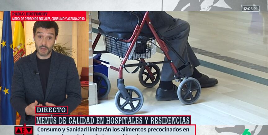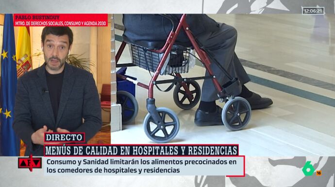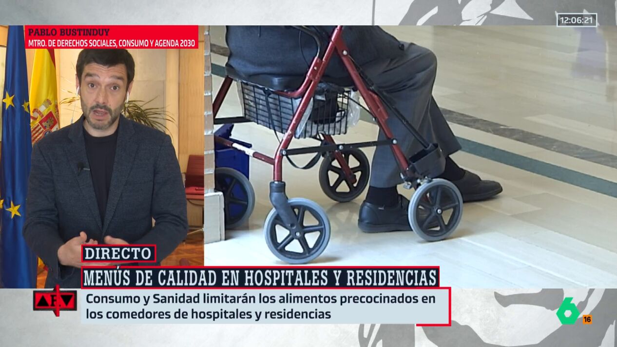 Pablo Bustinduy, ministro de Derechos Sociales, Consumo y Agenda 2030, conecta con Al Rojo Vivo para hablar del decreto que quieren presentar para garantizar el derecho a "una alimentación saludable" en los hospitales y centros de mayores. "Vamos a establecer unas guías mínimas para que tengan una alimentación digna, nutritiva y saludable", ha anunciado en el programa de Antonio García Ferreras, en el que ha asegurado que consultarán a especialistas para crear estos menús.