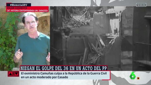 Julián Casanova, catedrático de Historia Contemporánea de la Universidad de Zaragoza, responde en Al Rojo Vivo a las polémicas palabras del exministro de UCD con Suárez, Ignacio Camuñas. En un acto con el líder del PP Pablo Casado, Camuñas sentenciaba: "Si hay un responsable directo de la Guerra Civil es el Gobierno de la República". "Y un golpe de Estado no es lo que ocurrió en 1936", añadía.