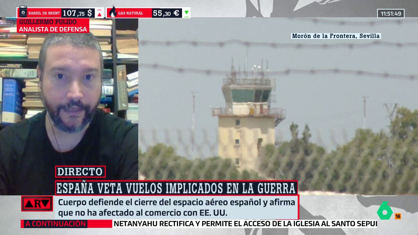 "¿Cómo de daño puede hacerle a Estados Unidos que España decida cerrar el espacio aéreo a los vuelos estadounidenses, al Ejército estadounidense que tenga pensado volar sobre nuestro espacio aéreo para unirse o para reforzar sus acciones en Irán?", ha preguntado Inés García Caballo a Guillermo Pulido, analista de Defensa, quien ha respondido destacando que "es un nudo logístico de cierta importancia".