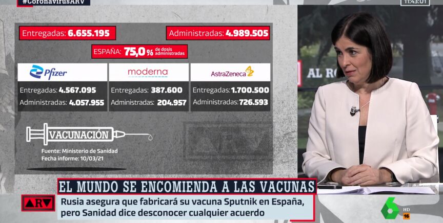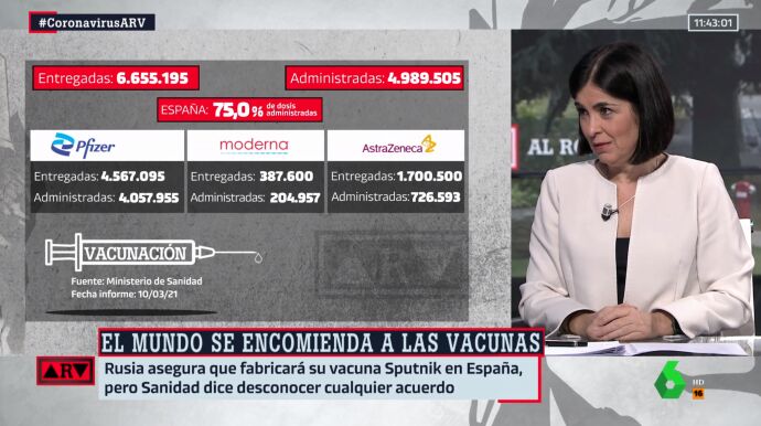 Junto con eso, otro de los aspectos más relevantes en los que ha incidido Darias es en la negación de la fabricación de la vacuna rusa, Sputnik V, en España: "No sé dónde se va a fabricar. Nosotros vamos a ir de la mano de la EMA y la Agencia Europea", señala.