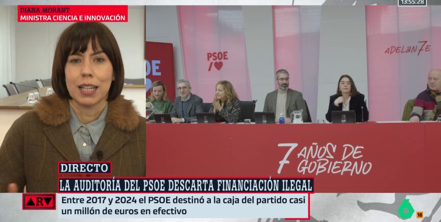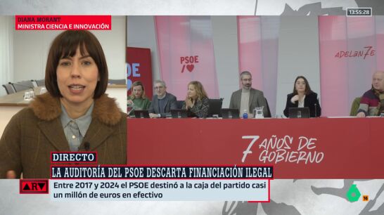 La ministra de Ciencia y actual secretaria general del PSPV-PSOE, Diana Morant, comenta en Al Rojo Vivo los datos extraídos de la auditoría encargada por el PSOE, la cual ha descartado financiación ilegal en el partido, pero ha hallado gastos "llamativos" en la etapa de Ábalos.