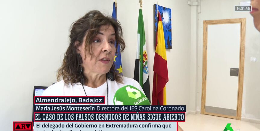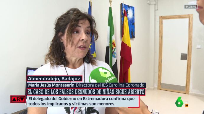 La directora del IES Carolina Coronada, María Jesús Monteserín, asegura que en su centro han adelantado los talleres que estaban previstos para el segundo cuatrimestre, tras los casos de robo de fotografías modificadas con Inteligencia Artificial. "En la educación en valores siempre hemos metido redes sociales. Pero lo hemos agilizado. Si esto estaba previsto para el segundo trimestre, hemos encendido la maquinaria hemos empezado a tratar esto en tutorías", ha explicado en directo en Al Rojo Vivo.