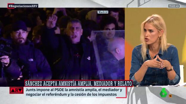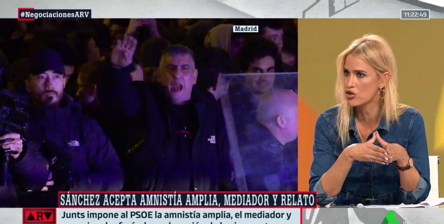 El líder de Vox, Santiago Abascal, volvió a acudir este jueves a la protesta concentrada en Ferraz, en contra de la amnistía, que acabó con fuertes disturbios policiales. En Al Rojo Vivo, la sindicalista Afra Blanco ha criticado su asistencia.