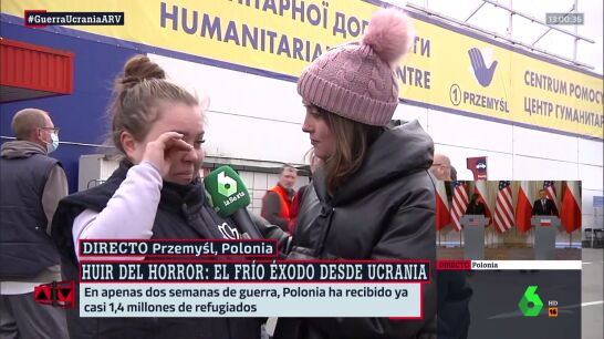 Ella tan solo tiene 23 años y explica entre lágrimas que tiene que "tener fuerza" para superar este difícil momento ya que su padre se ha tenido que quedar en el país para luchar en el frente.