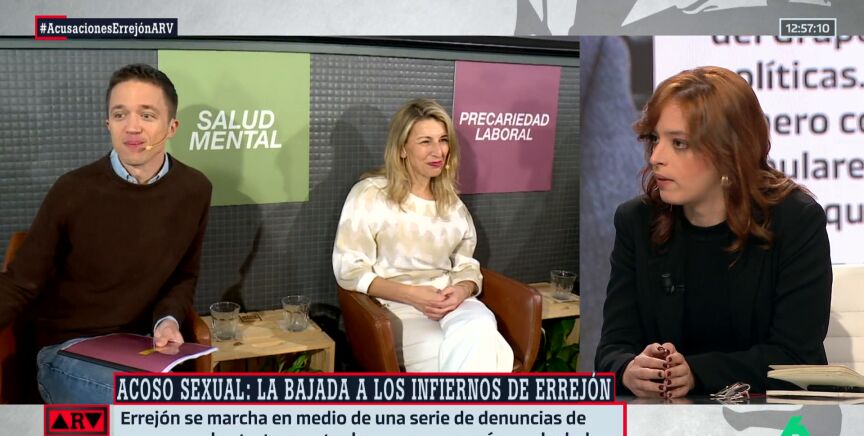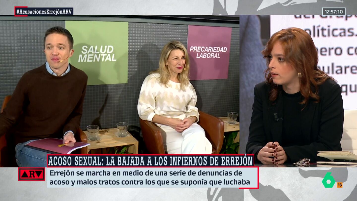 Elizabeth Duval, portavoz en materia de feminismo, igualdad y derechos y libertades LGTBI del equipo de Yolanda Díaz, se pronuncia en Al Rojo Vivo sobre la salida de Íñigo Errejón de Sumar este jueves, cuando anunció en un comunicado que dejaba su cargo y abandonaba toda actividad política en mitad de acusaciones de violencia machista. "¿Se va o le echáis?", le pregunta Antonio García Ferreras, a lo que ella responde que se va porque le iban a echar.
