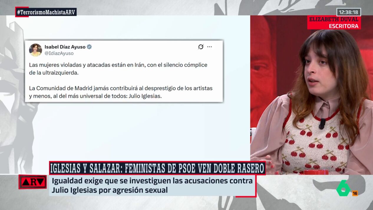 Elisabeth Duval critica las palabras de Isabel Díaz Ayuso defendiendo a Julio Iglesias después de que dos extrabajadoras del cantante le hayan denunciado por agresión sexual. "No nos pueden importar más las víctimas según de dónde vengan ni cómo afecten o no a quien más aprecia uno", asegura Duval, que destaca que "Ayuso siente que puede decir cualquier barbaridad porque la van a votar igual".