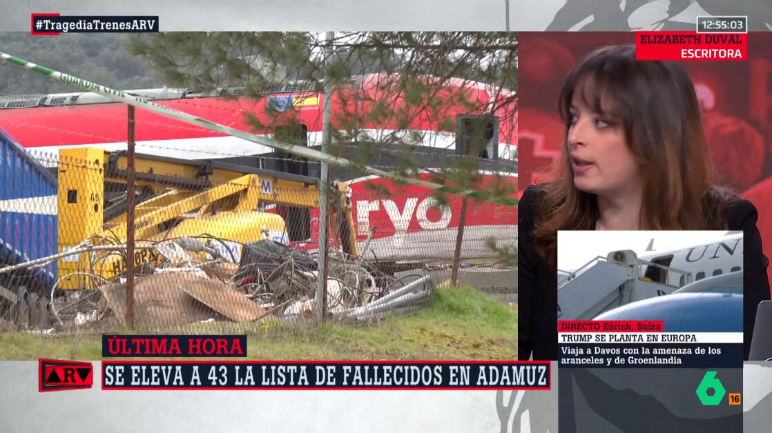 Tras los trágicos accidentes ferroviarios de Adamuz, en Córdoba, y de Gélida, en Barcelona, la filósofa y escritora Elizabeth Duval recuerda las críticas que ha hecho el PP a la inversión en infraestructuras ferroviarias, en concreto a Adif: "Yo estoy de acuerdo con esa crítica, ya que creo que no se ha invertido lo suficiente, pero el PP tampoco lo hizo", asegura.