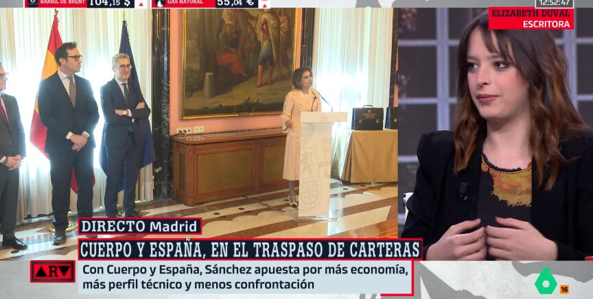 La escritora y filósofa Elizabeth Duval ha analizado en Al Rojo Vivo la reconfiguración del Gobierno tras el nombramiento de Carlos Cuerpo como vicepresidente primero y la designación de Arcadi España al frente de Hacienda, en sustitución de María Jesús Montero, que abandona el Consejo de Ministros para concurrir a las elecciones andaluzas del próximo 17 de mayo.