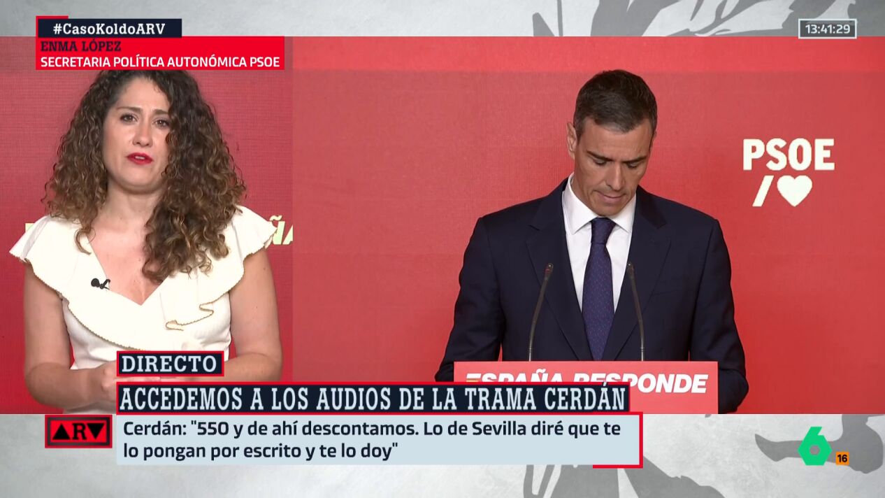Enma López ha realizado una intervención en Al Rojo Vivo después del informe de la UCO que sitúa a Santos Cerdán, ya exsecretario de organización del PSOE, como supuesto gestor de las presuntas mordidas y adjudicaciones en el entramado del caso Koldo. Además, ha hablado sobre la comparecencia de Pedro Sánchez, presidente del Gobierno, en la que pidió "perdón" a los ciudadanos.