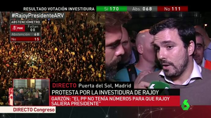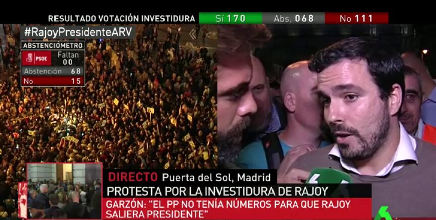Alberto Garzón asiste a la protesta en Sol por la investidura de Rajoy: "El PSOE ha tenido que ser intervenido para proporcionar un Gobierno del jefe de la Gürtel"