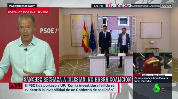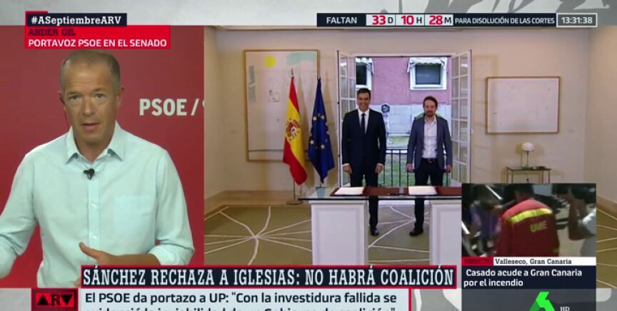 Ander Gil, portavoz del PSOE en el Senado, valora en el programa la última propuesta hecha por Unidas Podemos en forma de un documento con 119 páginas y cuatro opciones de Gobierno, todas ellas con una vicepresidencia y tres ministerios para Podemos.