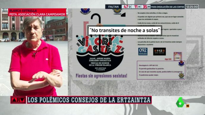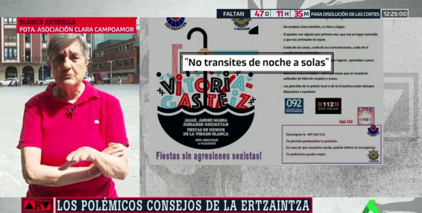 Blanca Estrella, presidenta de la asociación Clara Campoamor, considera desafortunado, el folleto que la Ertzainza reparte en las fiestas de Vitoria para evitar las violaciones. "Lo han hecho con buena voluntad, pero es como si todas las agresiones cayeran sobre nuestra espalda, como si de alguna manera nos echasen la culpa", critica.