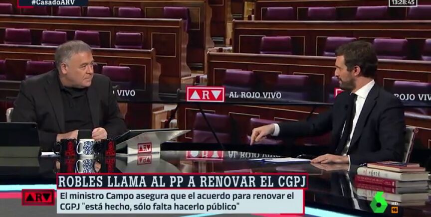 Durante su intervención en Al Rojo Vivo, Casado ha llegado a comparar la fusión de Caixabank y Bankia -que Iglesias desconocía- con la renovación del Poder Judicial. Se ha preguntado que por qué Sánchez sí dejó fuera a Podemos en esta negociación y no lo quiere hacer "para renovar las instituciones".