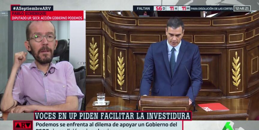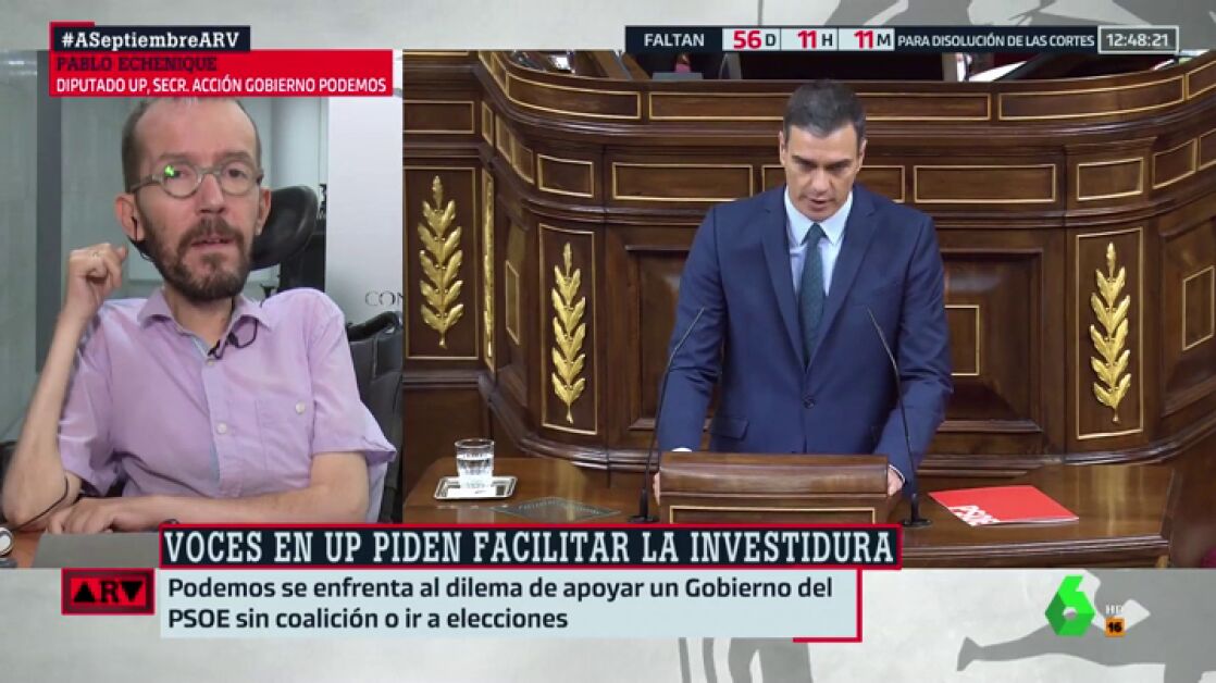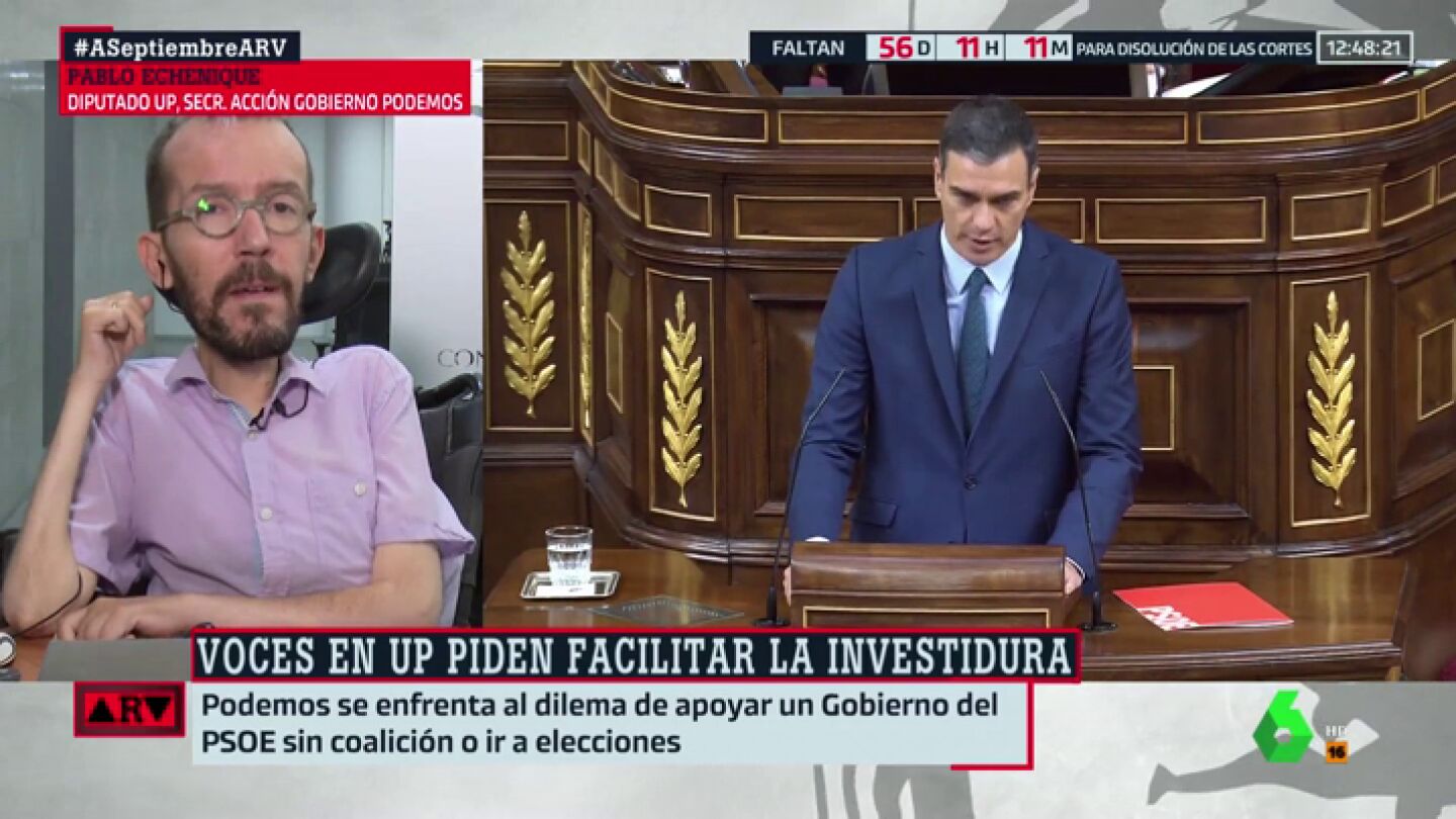 En este sentido, María Llapart le ha preguntado por la posible repetición electoral, a lo que Pablo Echenique ha contestado: "Creo que sería terrible que Pedro Sánchez pusiera al país en esa situación. La gente progresista en España dio una lección de democracia para que los partidos que defendemos la justicia social nos pusiéramos de acuerdo".