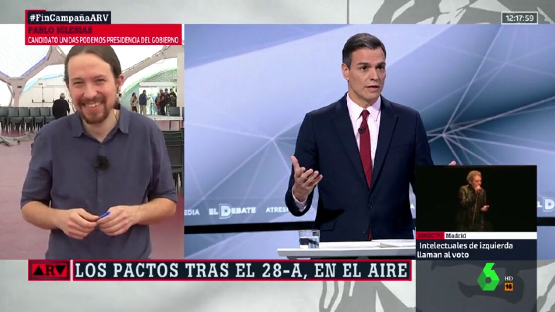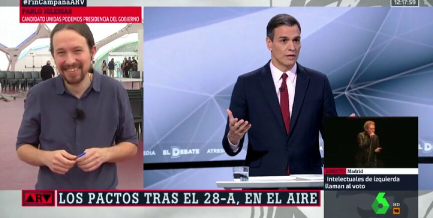Pablo Iglesias cuenta que su última charla ocurrió en pleno Debate Decisivo de Atresmedia. Cuando el líder de la formación morada se metió sin querer en la zona del PSOE al regresar del baño: "Iba mirando el móvil y sin darme cuenta me metí ahí. Sánchez y yo nos saludamos y comentamos un poco".