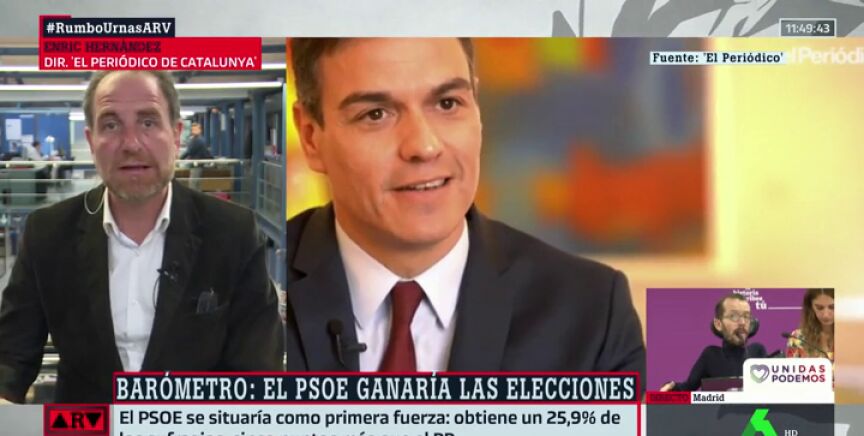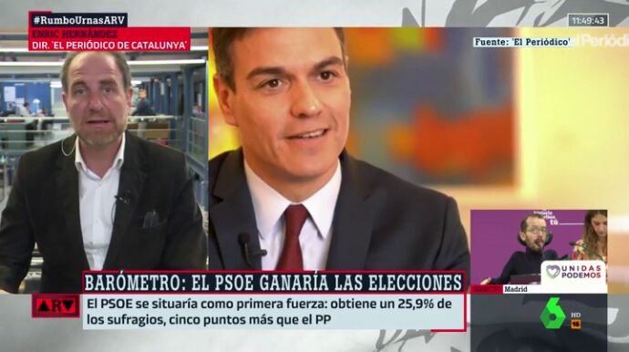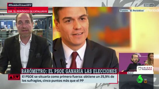 El director de 'El periódico de Catalunya', Enric Hernàndez, analiza en este vídeo el barométro de laSexta sobre las próximas elecciones generales. Según este barómetro, el PSOE ganaría las elecciones generales con un 25,9% en intención de voto mientras que Podemos (13%) y Vox (12,9) están empatados en cuarta posición. El PP ganaría la segunda plaza con un 20,1% y Ciudadanos (17,5%), sería tercera fuerza política.