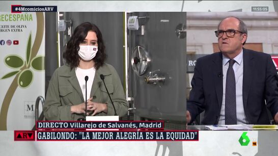 Durante su entrevista con Ferreras, Gabilondo también se ha referido a la candidata 'popular' como "la señora de la alegría" y ha respondido a algunas de sus declaraciones: "Yo estoy totalmente de acuerdo con la ilusión y la alegría de vivir, pero es que la alegría es tener empleo, oportunidades y servicios públicos de calidad, no una comunidad que genera desigualdad".