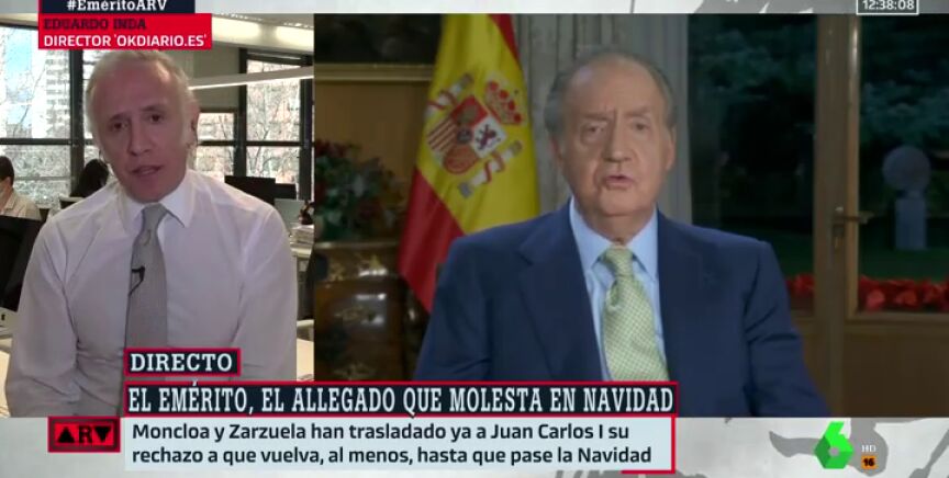 El periodista Eduardo Inda ha señalado en Al Rojo Vivo que el rey Juan Carlos tiene la intención de volver a España por Navidad, aunque tanto la Casa Real como el Gobierno han rechazado esa opción y "se le ha dicho que bajo ningún concepto se le ocurra volver a España".