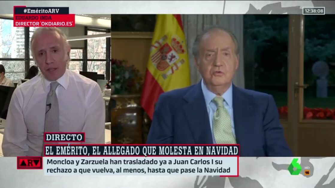 Eduardo Inda ha revelado en ARV que Moncloa y Zarzuela han trasladado al rey Juan Carlos su rechazo a que vuelva por Navidad a España. El monarca quiere regresar y, dice el periodista, está en "una situación cuasi depresiva".