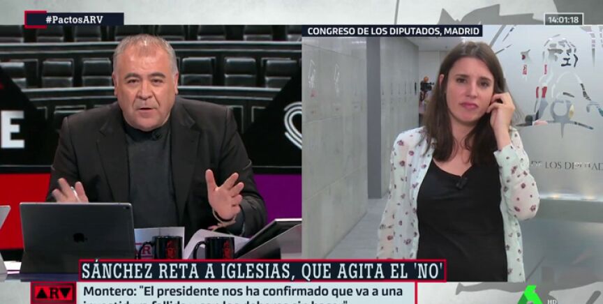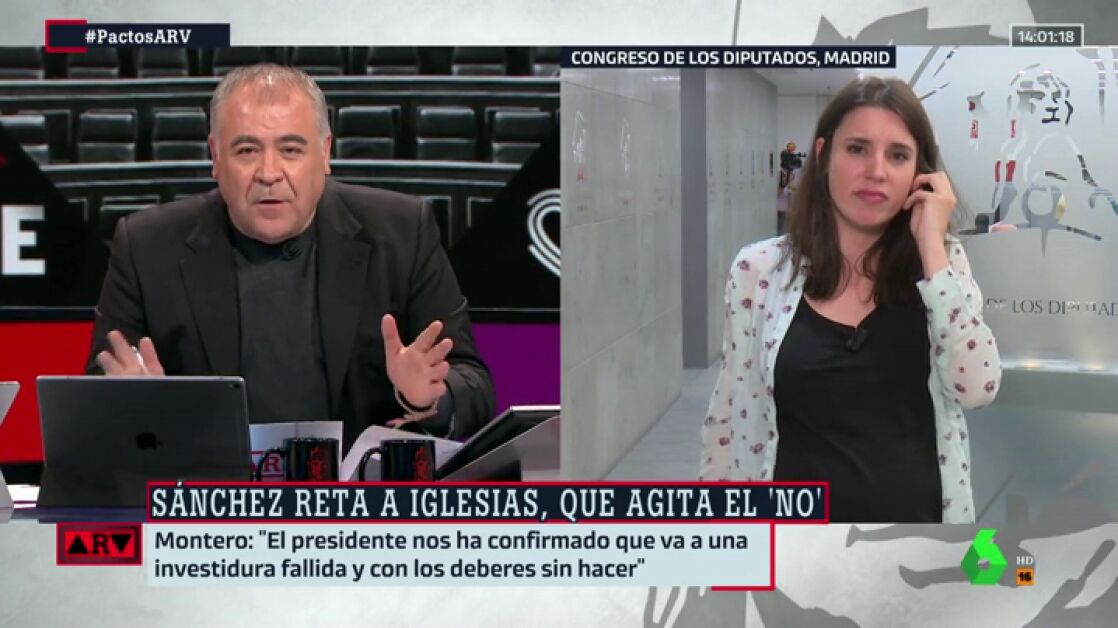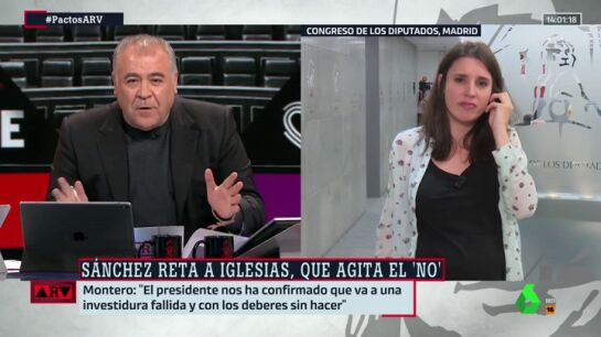 La portavoz de Unidas Podemos,Irene Montero, afirma que Pedro Sánchez ha informado a su formación de que "intentará buscar el apoyo a la derecha" y les ha confirmado que va a una investidura fallida.