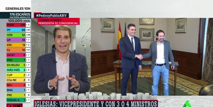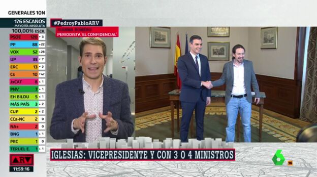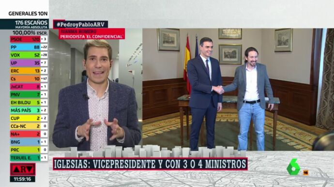 En cuanto a los dirigentes de Podemos que suenan como posibles ministros, ha señalado como nombres que están "en el aire" a Irene Montero, Héctor Illueca o Alberto Garzón, aunque "no hay confirmación" porque de momento se desconoce el número exacto de ministerios que tendrá el partido. No obstante, "todo apunta a que serán tres, que fue la oferta que se hizo en julio a Unidas Podemos", ha concluido.