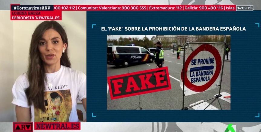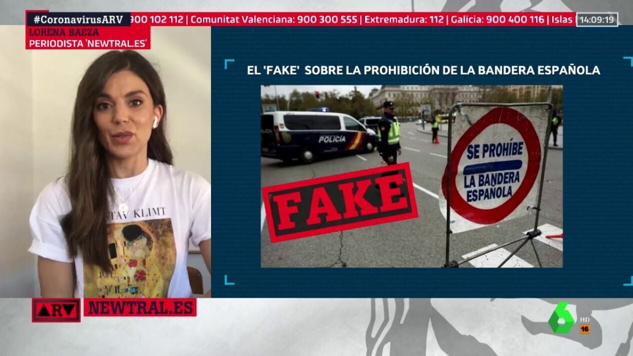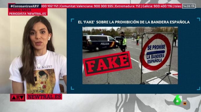 En la imagen difundida, aparece un control policial con una señal en la que reza "Se prohíbe la bandera española", pero en realidad se trata de una fotografía manipulada: ni están prohibidas las banderas ni la Policía había colgado ese cartel. La foto original, tomada por un fotógrafo de la agencia Efe en Madrid, muestra un cartel en el que simplemente se lee "Alto, Control Policía".