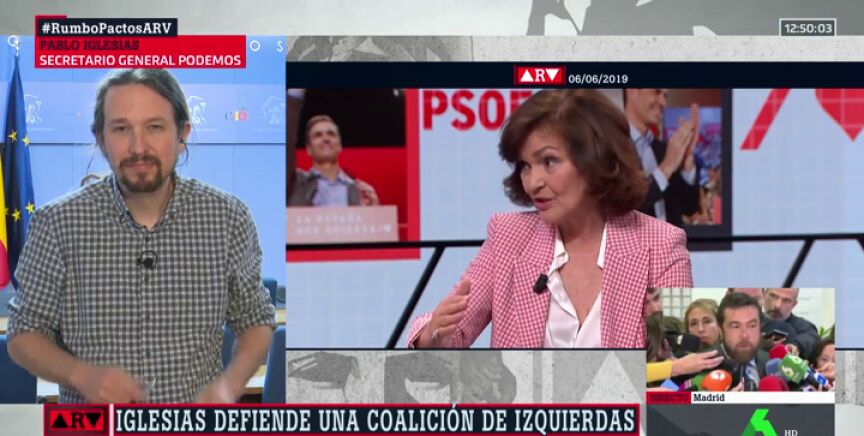 Carmen Calvo, en su entrevista en Al Rojo Vivo, invitó a Pablo Iglesias a reflexionar "sobre lo que a él le han dicho las urnas" el 26M y recordó que los números no dan. "No sumamos una mayoría", afirmó Calvo.