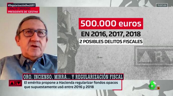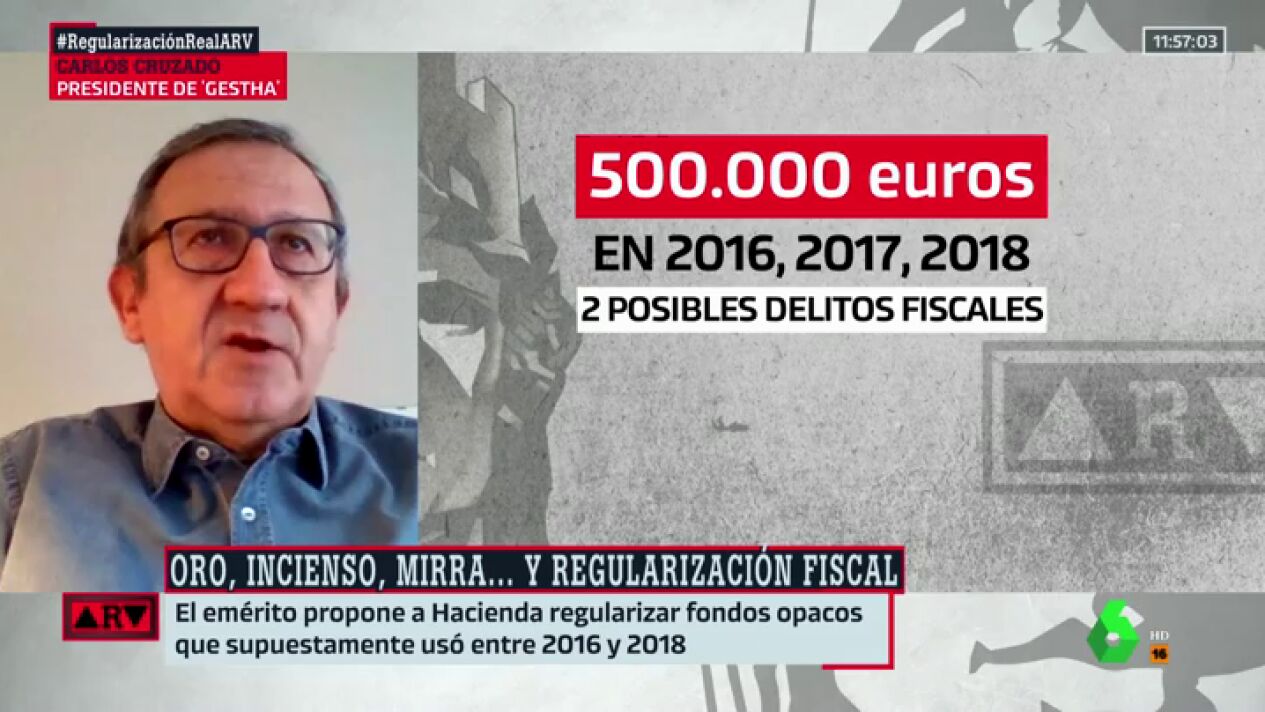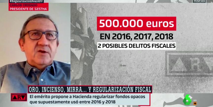 El rey emérito Juan Carlos I podría librarse de la comisión de un delito fiscal si regularizara su deuda con el fisco. Así lo confirma en 'Al Rojo Vivo' el presidente del Sindicato de Técnicos de Hacienda (Gestha), Carlos Cruzado: "Si se produce la regularización se evitarían, en caso de que no fuera un delito, las posibles sanciones tributarias y, en el supuesto de que superara la cuota de los 120.000 euros, se evitaría el delito fiscal".