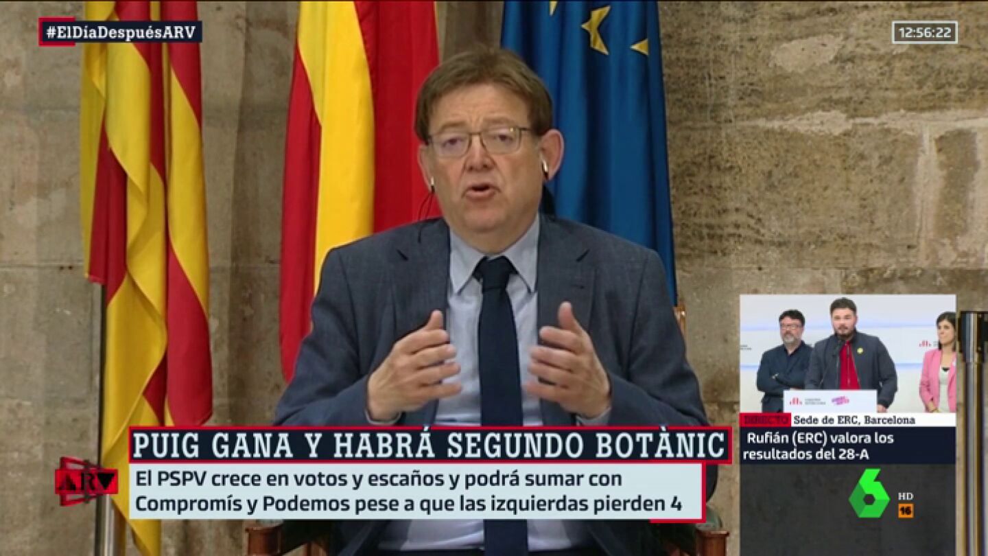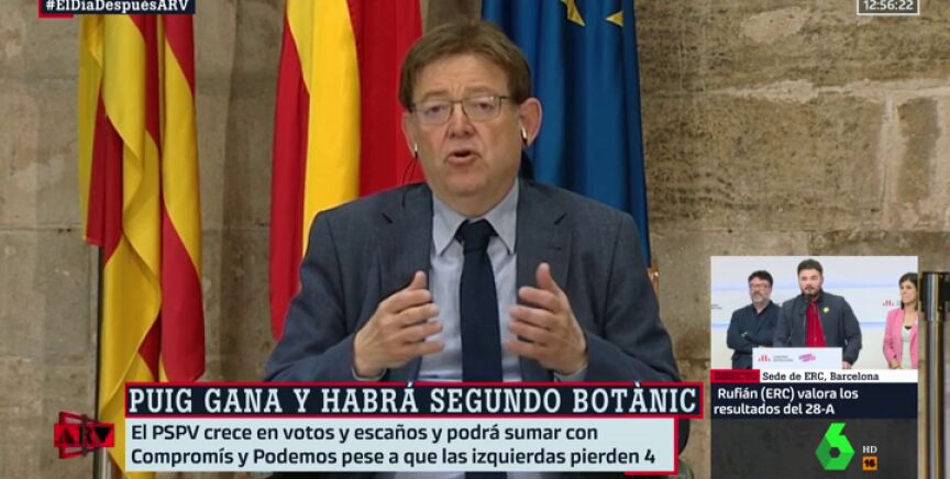 El president de la Generalitat Valenciana, Ximo Puig, valora como "positivo" el adelanto electoral ante el peligro de la irrupción de la extrema derecha. Así, Puig (PSPV) logra la primera victoria desde 1991 y liderará otro pacto de la izquierda en la Comunitat Valenciana.