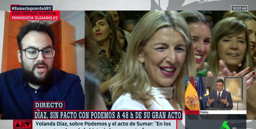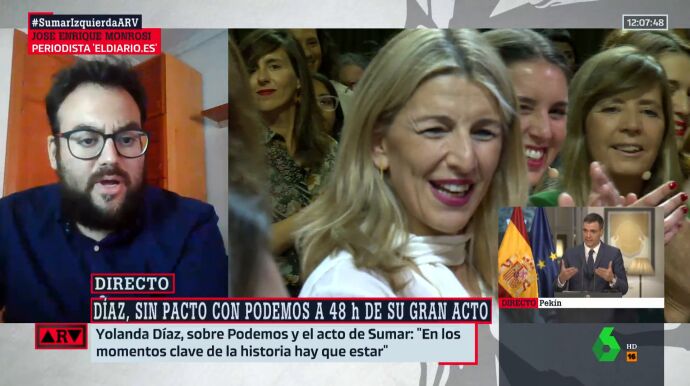 El periodista José Enrique Monrosi ha hecho un análisis sobre el acto de Sumar del próximo domingo en el que se presentará la candidatura de la vicepresidenta del Gobierno, Yolanda Díaz, quien ha hecho un llamamientoa los dirigentes de Podemos para que la acompañen.