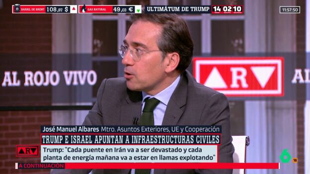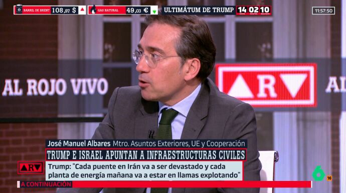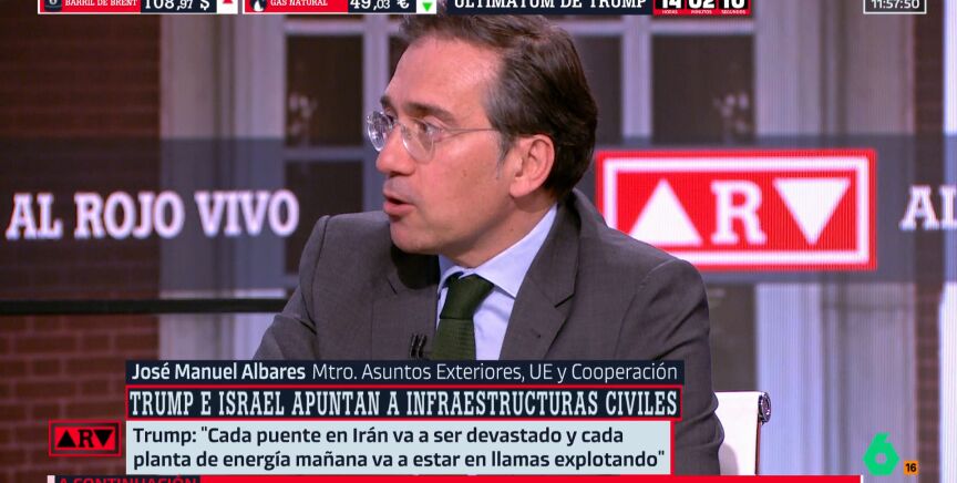El ministro de Asuntos Exteriores, José Manuel Albares, ha sido entrevistado en Al Rojo Vivo, donde ha abordado la guerra en Irán y ha lanzado un doble llamamiento. Por un lado, ha pedido "a todas las partes, muy claramente a Irán y a Estados Unidos, iniciar una desescalada", advirtiendo de que las consecuencias serían "gravísimas para la economía, el medio ambiente y conllevarían una crisis humanitaria mayor", en un contexto que, según ha señalado, apunta a una "lógica de guerra perpetua".