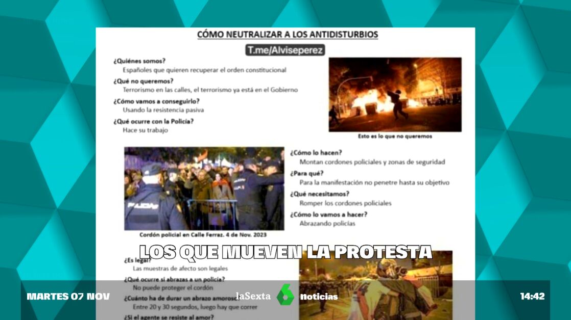 Agitadores de extrema derecha están dando consejos de cómo "neutralizar" a los agentes antidisturbios en manifestaciones como la celebrada este lunes ante la sede del PSOE en Madrid. Para ello, están moviendo en las redes sociales un 'manual', dirigido a "españoles que quieren recuperar el orden constitucional", con una especie de pregunta-respuesta sobre cómo actuar en estas protestas.
