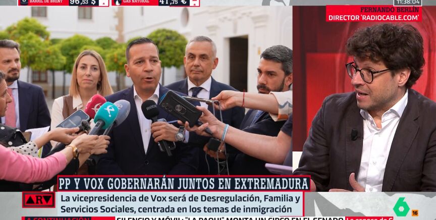 En Al Rojo Vivo, el director de 'Radiocable.com', Fernando Berlín, ha analizado el acuerdo entre PP y Vox en Extremadura, que permitirá la investidura de María Guardiola como presidenta de la Junta tras sus dos intentos fallidos. El pacto incluye importantes cesiones a la formación de extrema derecha, que asumirá una vicepresidencia y dos consejerías: Familia, Desregulación y Servicios sociales y Agricultura, Ganadería y Medio Natural.