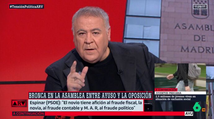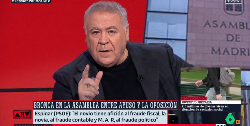 El presentador de Al Rojo Vivo ha analizado la bronca política que ha sacudido hoy la Asamblea de Madrid, donde los puñales han volado entre Isabel Díaz Ayuso y la oposición. "Ha sido una sesión cañera".