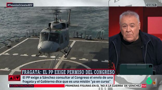 Ferreras cuestiona la postura del PP ante el envío de una fragata junto al Charles de Gaulle a Chipre tras el ataque en la región: "¿Están a favor o en contra?". Además, critica que Aznar "no es referencia para nada" por su papel en la guerra de Irak.