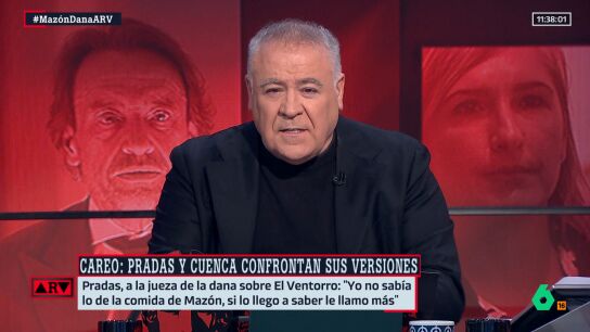 "Tanto Mazón como Cuenca se han estado riendo, pero no de nosotros, ni de los valencianos, sino de las víctimas, de los muertos y de sus familias", lamenta muy duro el presentador de Al Rojo Vivo después de que Cuenca haya devuelto su teléfono móvil con todo borrado. Por su parte, el periodista Carlos Segovia destaca la actuación de la jueza: "Si no fuera por la jueza no tendríamos este careo, este careo se produce porque Salomé está diciendo cosas fueres y aparentemente reales". Además, el periodista recuerda que "Salomé Pradas nos estuvo mintiendo durante semanas y ocultando información" hasta ahora y destaca que Cuenca, "probablemente sea la persona junto a Mazón que más sabe lo que hizo Mazón".