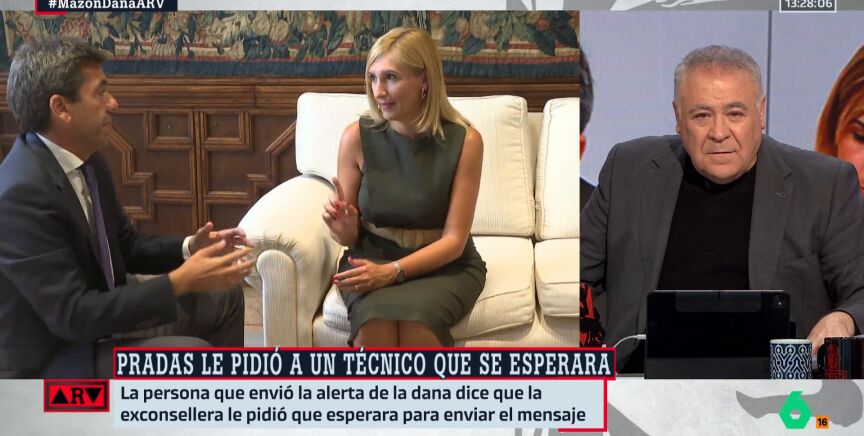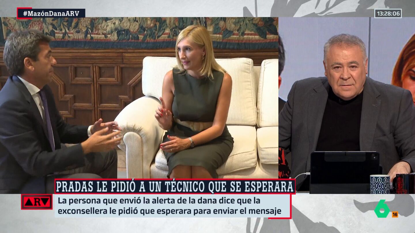 "Pero aún hay más", asegura Ferreras. "Hoy las familias de las víctimas están enterándose de que cuando se envía ese mensaje se hace tarde, por orden de una consellera. ¿Por qué? Porque está intentando localizar a Mazón (...) Hoy el técnico, ante la jueza, ha dicho que tenía la orden de no enviar ese alerta", afirma el periodista.