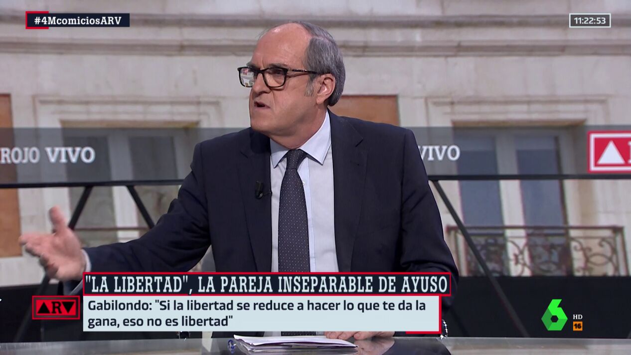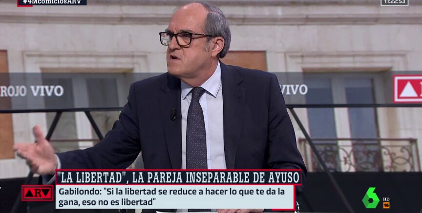 Ante la pregunta de García Ferreras sobre si se ve como miembro de un Gobierno presidido por la candidata de Más Madrid, Mónica García, o por Pablo Iglesias, Gabilondo confiesa: "Espero que eso no pase". "Creo modestamente que puedo liderar la recuperación de Madrid. Mis datos, mi expectativa… la llamada que hago a la ciudadanía es para liderar yo esa expectación. Tengo poca tendencia para verme en ninguna cosa como miembro de un gobierno (…) No sé verme, pero siempre apoyaré desde donde esté un gobierno progresista", añade.