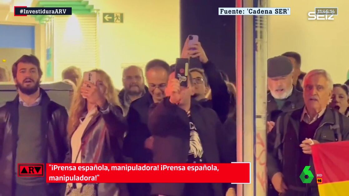 Tras los cánticos contra PSOE y PP, tanto el vicepresidente de la Junta, como el consejero de Industria, Mariano Veganzones y el concejal de Comercio del Ayuntamiento de Valladolid, Víctor Martín, comenzaban a corear también consignas contra la prensa como el ya habitual "prensa española, manipuladora". Y lo hacía a medio metro de una una periodista de la cadena Ser que hacía su trabajo. Varios de ellos, además, sacaban sus móviles para grabar a la periodista que hacía su trabajo.