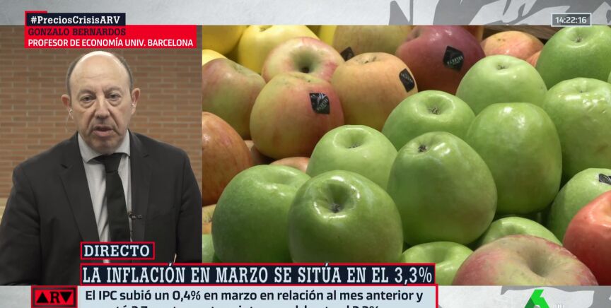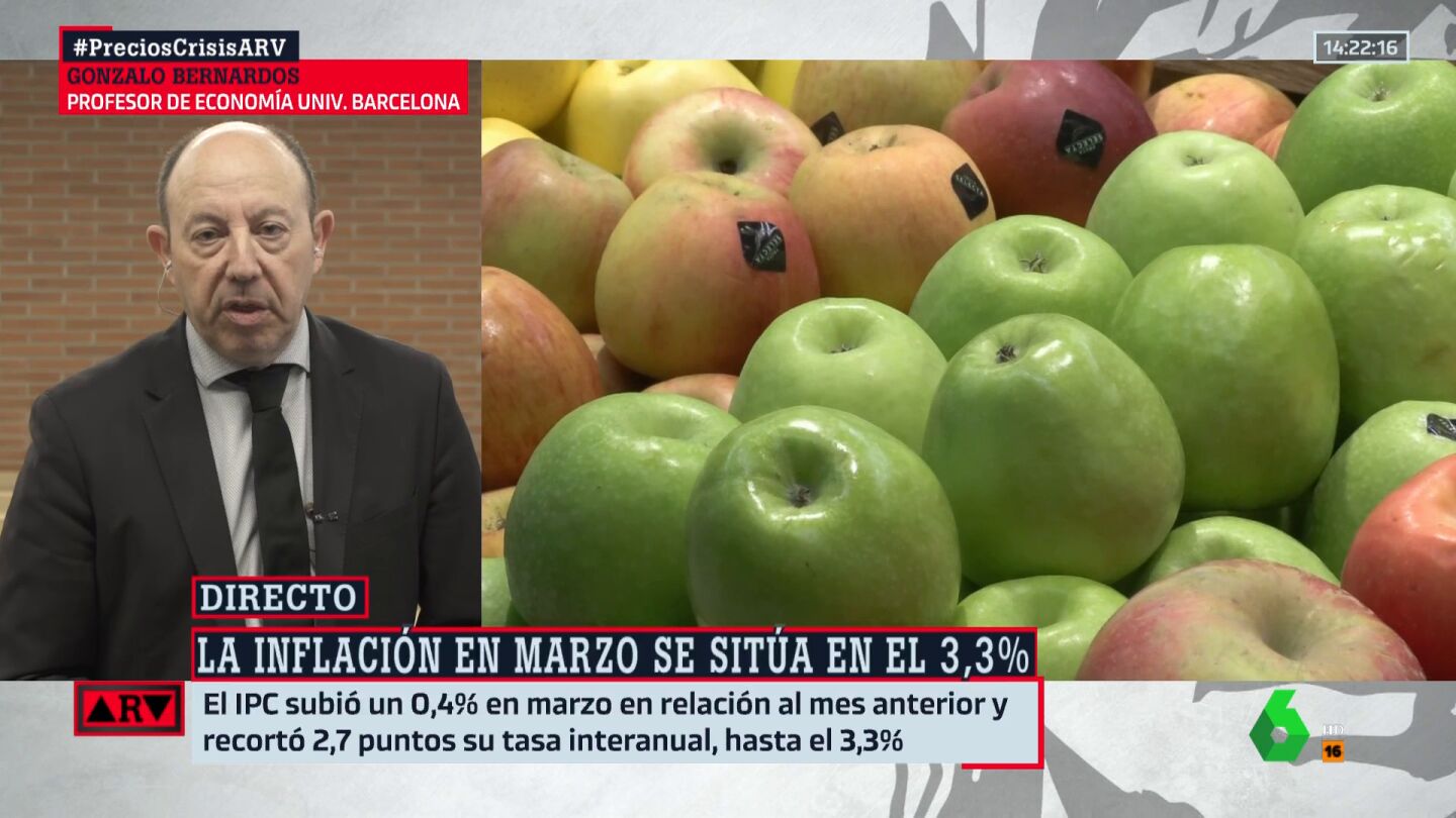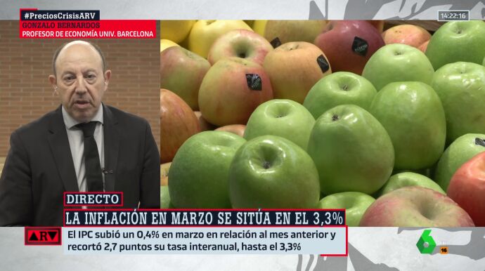 El economista Gonzalo Bernardos ha analizado los datos de la inflación publicados este viernes por el INE, que confirman que la subida de los precios se relajó hasta el 3,3% en marzo, y ha adelantado que de no ser por los alimentos, el IPC sería negativo.
