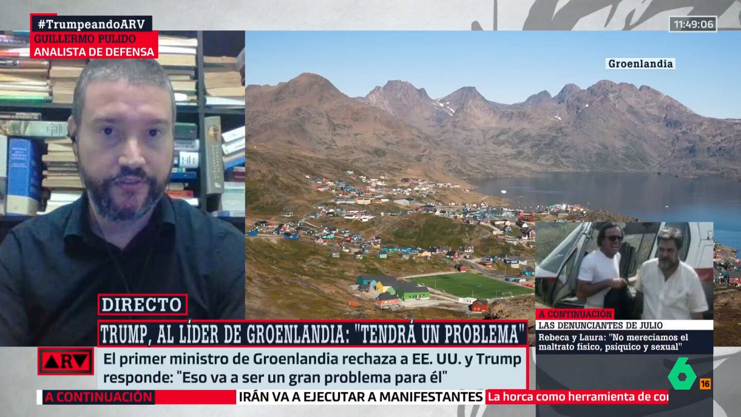 Guillermo Pulido, analista en Defensa, analiza en este vídeo de Al Rojo Vivo la situación de Groenlandia tras las amenazas de Donald Trump. "En el caso de que haya una invasión o fuercen la venta de Groenlandia, la OTAN se vería completamente comprometida y, quizá, destruida", explica el experto, que detalla que "esa es la baza con la que está jugando el Gobierno danés a través del legislativo del Congreso, el Senado y la Cámara de Representantes".