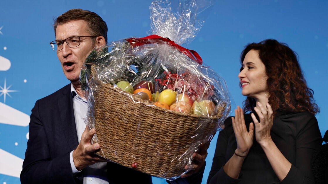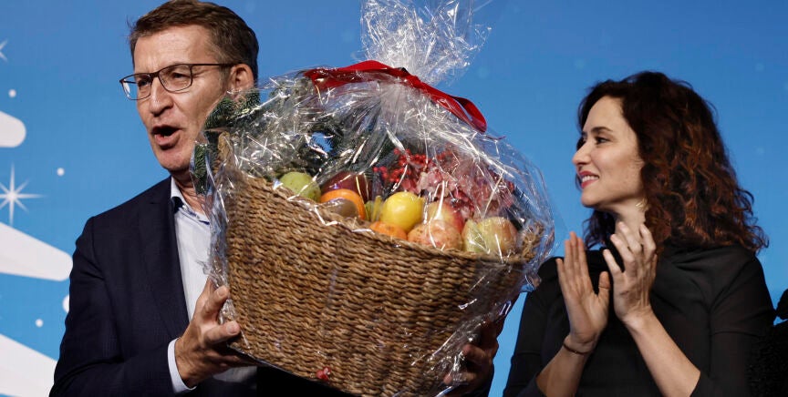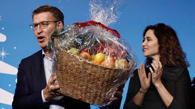 Isabel Díaz Ayuso reparte cestas de fruta en la cena de Navidad del PP de Madrid
