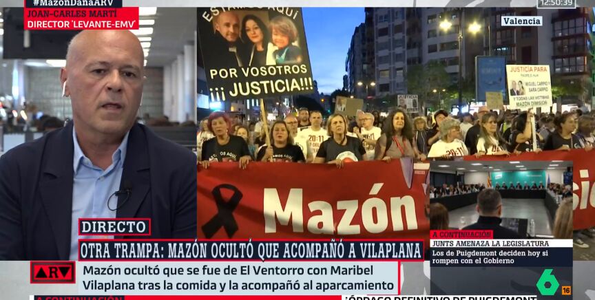 Por último, Martí cree que Mazón no era consciente de lo que estaba pasando al acompañar a Vilaplana hasta el parking: "No es consciente hasta que no llega al Palau, sobre las 20 h, a pesar de que él mantiene que estaba totalmente informado. Pero al acompañar a Vilaplana al parking demuestra que no sabía qué estaba pasando", sostiene el director. "Cuando Mazón llega al Palau, es consciente de lo que está pasando, pero ya son las 20 h, y la alarma sonó a las 20:11 h", afirma Martí. En el vídeo podemos ver al completo esta información.