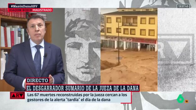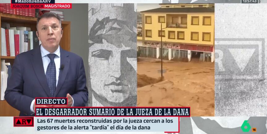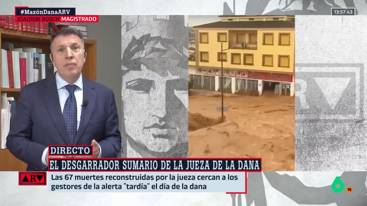 Tras el desgarrador sumario de la jueza de Catarroja, Nuria Ruiz Tobarra, que instruye la investigación de la DANA que asoló Valencia el pasado 29 de octubre, Joaquim Bosch, magistrado y miembro de Juezas y Jueces para la Democracia, explica algunos puntos clave de esta instrucción. El sumario expone que las muertes de ese día se produjeron antes de que se enviara la alerta a los móviles y que las "muertes eran evitables", no así los daños materiales.
