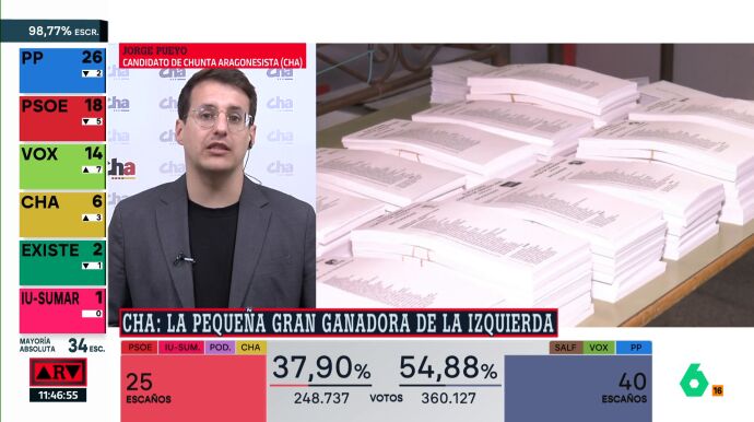 Jorge Pueyo ha confesado que, pese a estar satisfecho con el resultado que Chunta Aragonesista ha logrado en las elecciones, tiene un sabor "agridulce" al ver cómo Vox ha logrado el doble de escaños que hace tres años, pasando de 7 a 14.