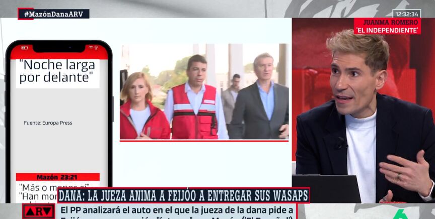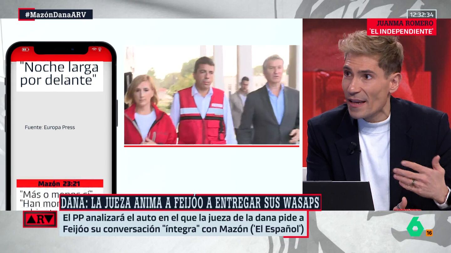 'Juanma Romero, periodista de 'El Independiente', recuerda en el plató de Al Rojo Vivo que "Feijóo tejió una estrategia politica para responsabilizar al Gobierno central" de la DANA, algo que ha quedado desmontado por los Whatsapp que el líder del PP se mandó con Mazón ese día. No obstante, el periodista destaca que tampoco se puede "endosar a Feijóo la responsabilidad de lo que pasó" ya que eso sería "un exceso por parte del Gobierno y del PSOE, igual que pedirle su dimisión".
