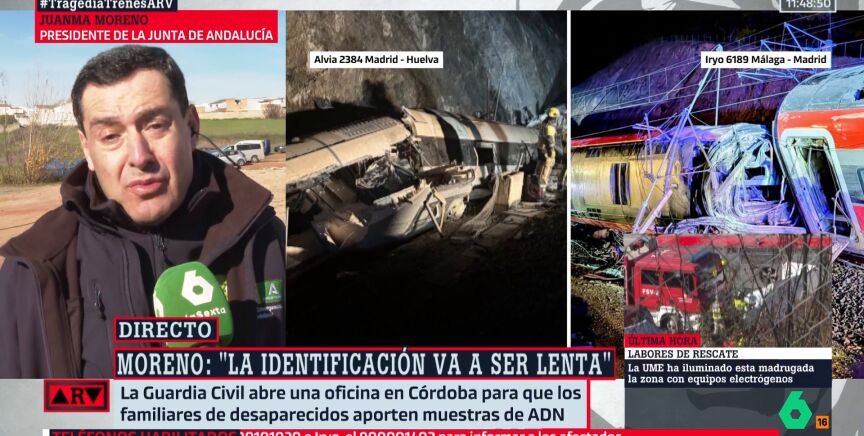 El Gobierno y la Junta de Andalucía trabajan conjunta y coordinadamente para responder con la mayor efectividad posible a la tragedia de Adamuz. Así lo destaca el presidente andaluz, Juanma Moreno Bonilla, que asegura en Al Rojo Vivo que, a diferencia de situaciones anteriores, las administraciones dependientes del PSOE y el PP están operando al unísono y sin fisuras ante la emergencia.