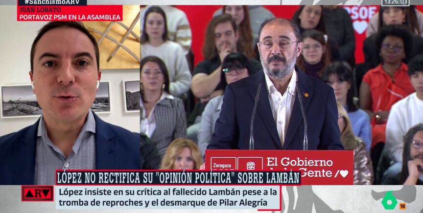 Juan Lobato, exsecretario general del Partido Socialista de la Comunidad de Madrid y actual diputado en la Asamblea, critica las palabras que el ministro Óscar López ha dedicado al histórico socialista Javier Lambán, fallecido este pasado mes de agosto. López ha culpado a Lambán de los malos resultados de Pilar Alegría en las elecciones de Aragón por la "oposición" realizada antes a Jorge Azcón (PP).