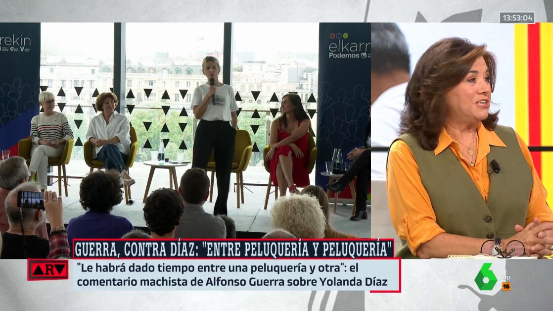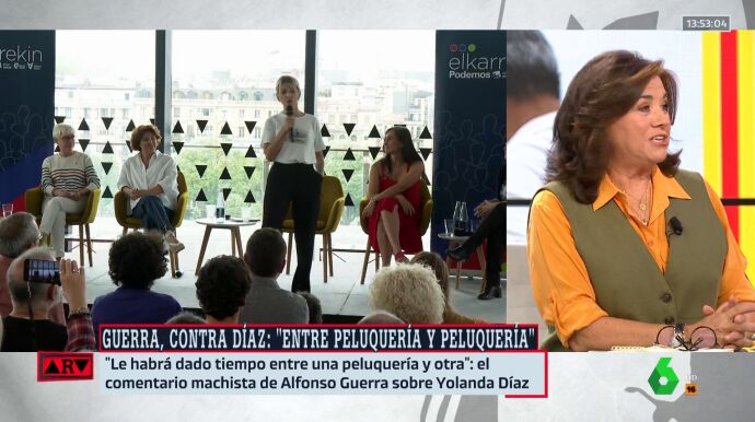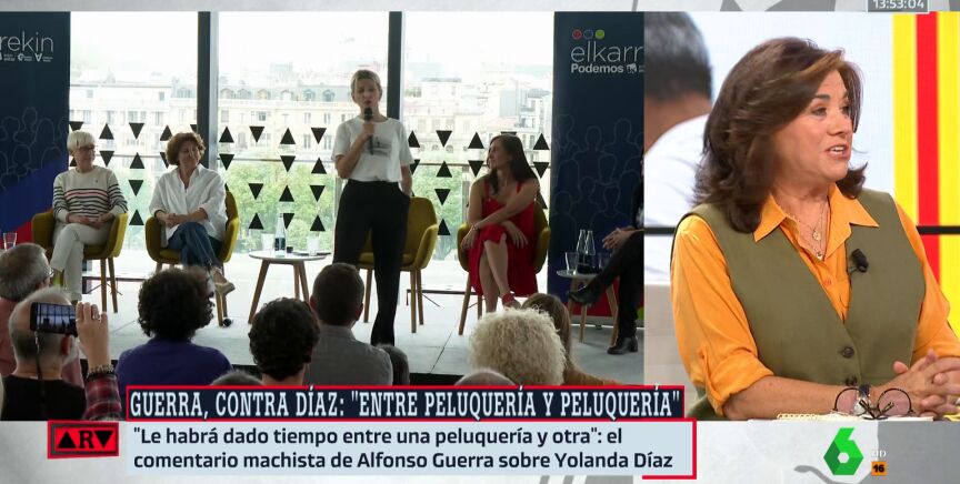 Segúnseñala en Al Rojo Vivo Lucía Méndez, periodista de El Mundo, "nadie puede salir a 21 de septiembre de 2023 en su sano juicio diciendo esas cosas", en alusión al comentario machista que le ha dedicado Alfonso Guerra a Yolanda Díaz en una entrevista en Antena 3: "Le habrá dado tiempo entre una peluquería y otra"